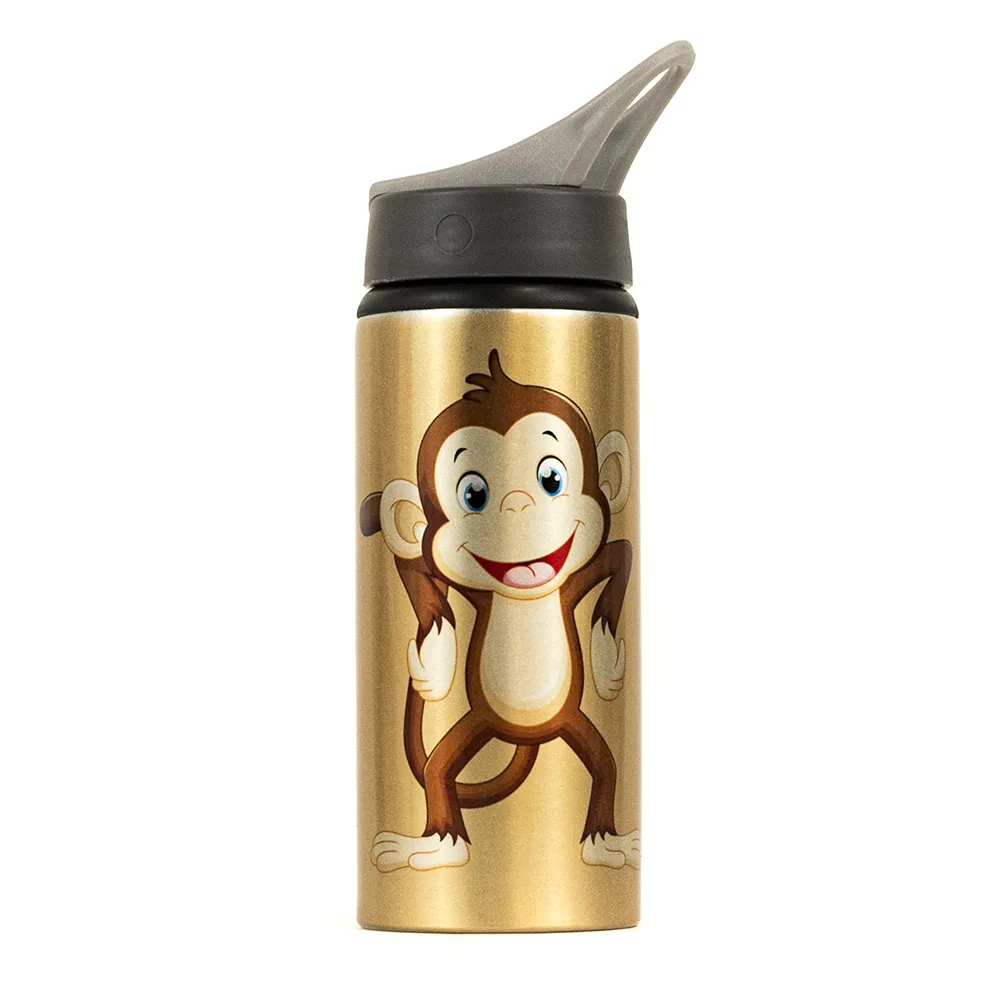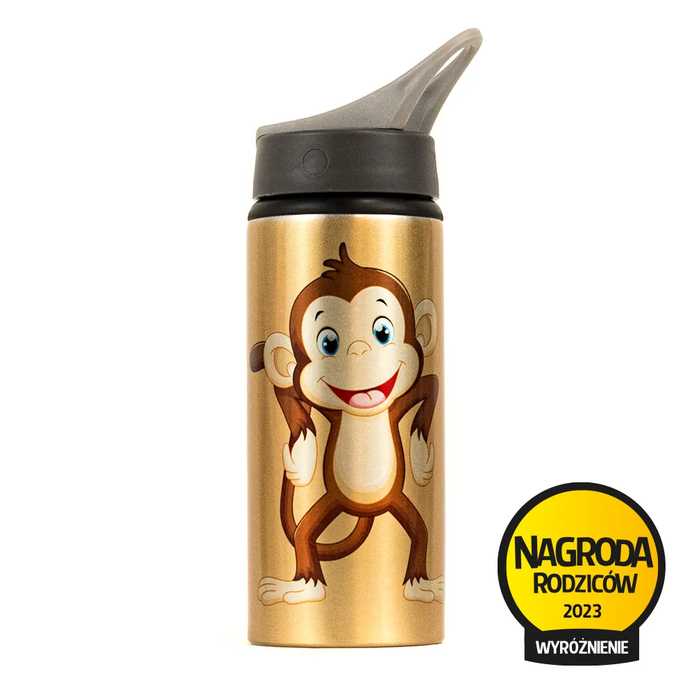 Aluminiowy bidon na wodę lub inny napój z małpką. Dziecięcy bidon ma pojemność 650 ml i doskonale mieści się nawet w kieszeni plecaka przedszkolnego. Bidon posiada pojedynczą ściankę, składany ustnik i słomkę oraz wygodny uchwyt do trzymania. Słomka w butelce jest wyciągana, dzięki czemu bez problemu można ją dokładnie umyć. Ustnik jest plastikowy. Bidon ma metaliczny lekko mieniący się połysk, przez co jest bardzo oryginalny. Nadruk wykonano metodą sublimacji, dzięki czemu jest niewyczuwalny w dotyku i bardzo trwały.