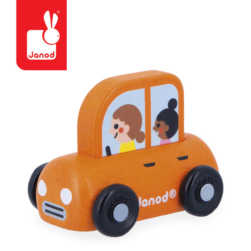 Samochód rodzinny z serii Cross Roads francuskiej marki JANOD to doskonałe uzupełnienie maty-dywanu do zabawy z drogą Miasto z tej samej kolekcji. Pojazd wykonany jest z drewna, posiada poręczne kształty dopasowane do małych rączek, intensywny pomarańczowy kolor, a dzięki kółkom łatwo porusza się po różnych powierzchniach. W środku znajdują się dwójka pasażerów (mama i dziecko), co zachęca malucha do snucia własnych historii i kreatywnej zabawy.