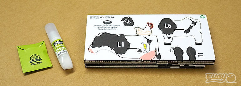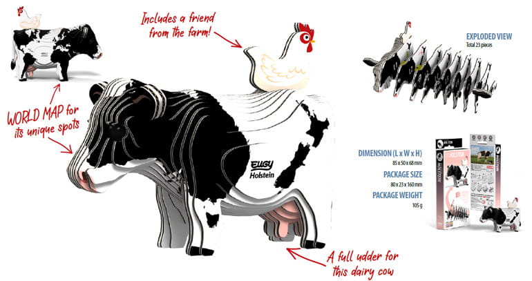 Eugy zaprojektowane w Nowej Zelandii są wykonane z przyjaznego dla środowiska kartonu pochodzącego z recyklingu i farby na bazie ryżu. Zestaw zawiera 23 ponumerowane elementy układanki, nietoksyczny klej oraz instrukcję do zbudowania krówki holsztyńsko-fryzyjskiej. Zbierz całą serię zwierząt, ptaków, dinozaurów i wiele innych. Dla dzieci w wieku 6 lat +.
