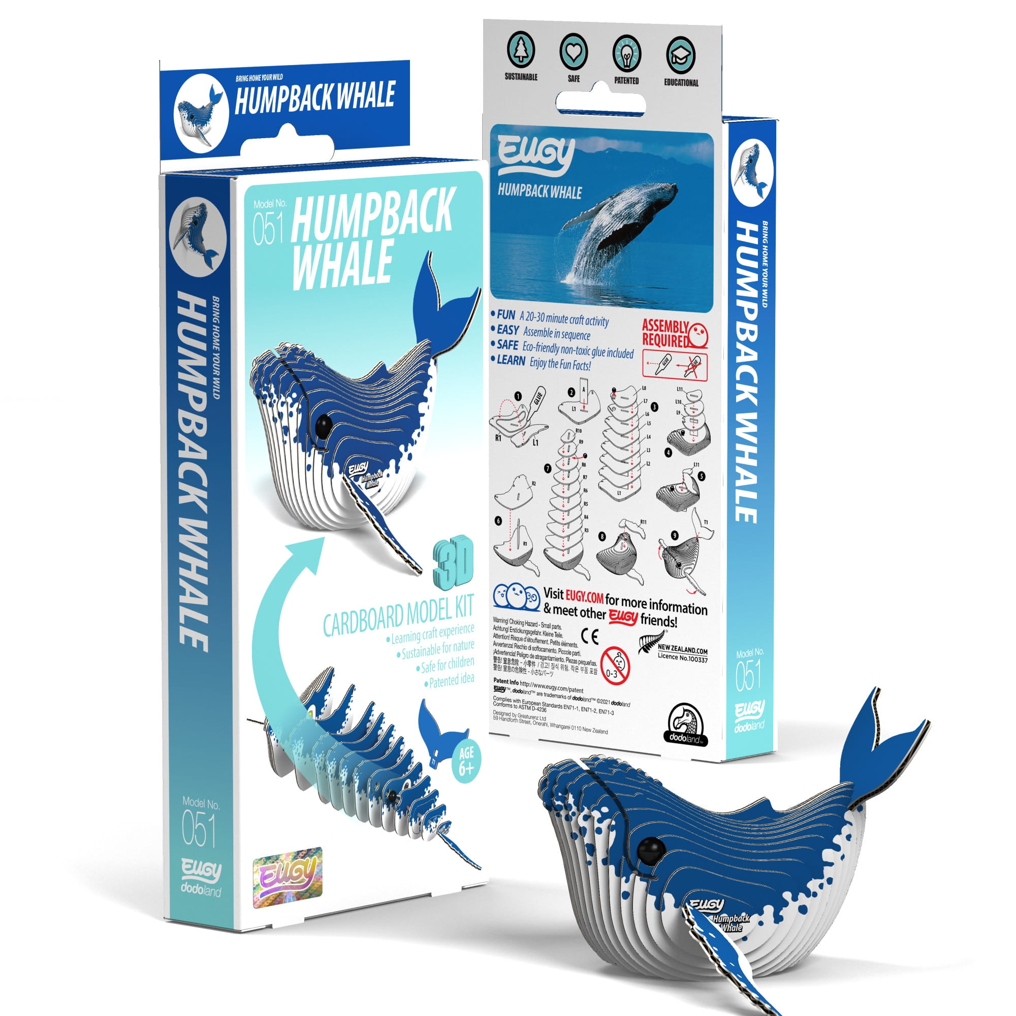 Eugy zaprojektowane w Nowej Zelandii są wykonane z przyjaznego dla środowiska kartonu pochodzącego z recyklingu i farby na bazie ryżu. Zestaw zawiera ponumerowane elementy układanki, nietoksyczny klej oraz instrukcję do złożenia wieloryba. Zbierz całą serię zwierząt, ptaków, dinozaurów i wiele innych. Dla dzieci w wieku 6 lat+.