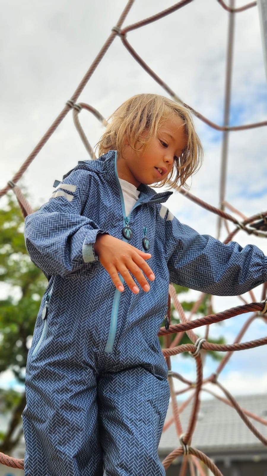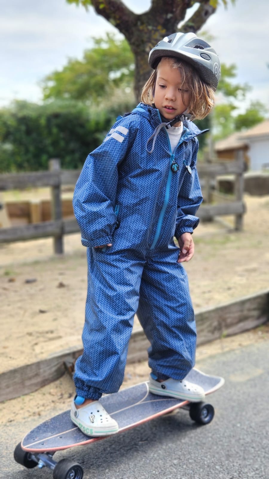 Po prostu załóż kombinezon na swoje codzienne ubranie i przygotuj się na niekończącą się zabawę na świeżym powietrzu! Kombinezon jest całkowicie wodoodporny, ale jednocześnie oddychający, więc nie pocisz się w nim. Można go złożyć do kompaktowej kieszeni (wewnątrz lewej nogawki), dzięki czemu można go nosić w plecaku. Z praktycznymi kieszeniami, w których można schować skarby podczas przygód. Elastyczne gumki na stopy oraz regulowane rękawy i kaptur sprawiają, że kombinezon pozostaje na swoim miejscu podczas każdej aktywności. Odblaskowa taśma na ramionach zapewnia lepszą widoczność w ciemności.