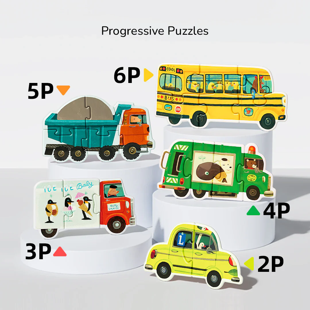 Liczba elementów: Samochód (2 elementy), Samochód policyjny (2 elementy), Samochód z lodami (3 elementy), Śmieciarka (4 elementy), Samochód dostawczy (5 elementów), Autobus szkolny (6 elementów)