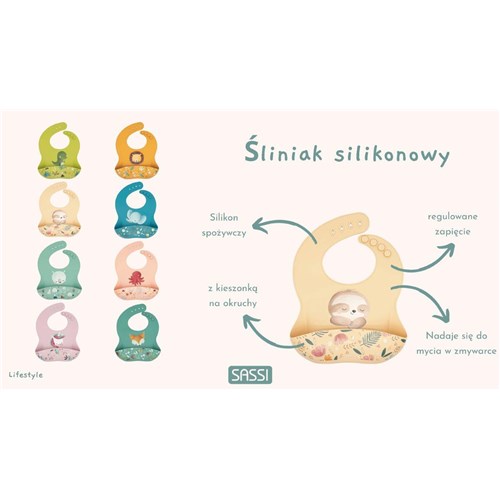 Silikonowy śliniak włoskiej marki SASSI to niezastąpiony produkt, które pomaga utrzymać porządek przy stole i chroni ubranka dziecka podczas karmienia. Wykonany w 100% z silikonu spożywczego, wolnego od BPA, PVC i ftalanów, śliniak zapewnia pełne bezpieczeństwo i komfort użytkowania – zarówno dla dziecka, jak i dla rodzica.