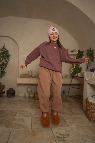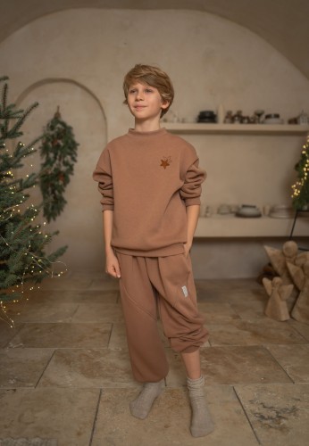 Ciepłe spodnie w pięknym orzechowym kolorze, z wyjątkowo miękkiej i przyjemnej dzianiny. Luźny i obszerny krój z szerokimi nogawkami sprawia, że są niezwykle wygodne. W pasie marszczona guma. Spodnie posiadają kieszenie oraz ozdobne przeszycia z przodu na nogawkach. Dodatkowo z tyłu ozdobna kieszonka. Nogawki wykończone ściągaczami, co także zapewni wygodę ich ubierania. Tkana naszywka z logo marki na nogawce.