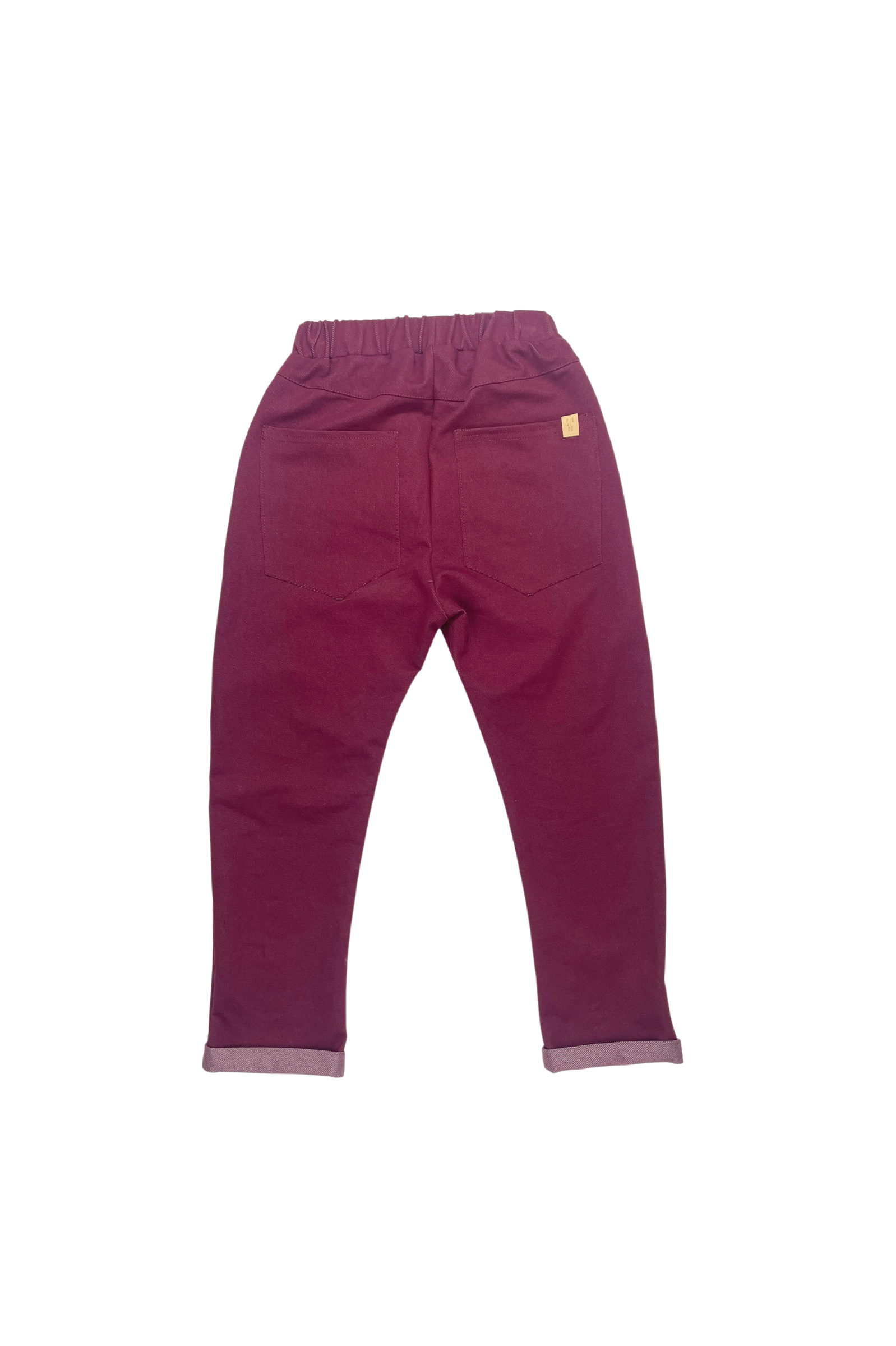 Spodnie jeansowe z miękkiej bawełny. Posiadają na przodzie i na tyle kieszonki oraz w pasie gumkę. Kolor : burgund. Nogawki można swobodnie podwinąć.