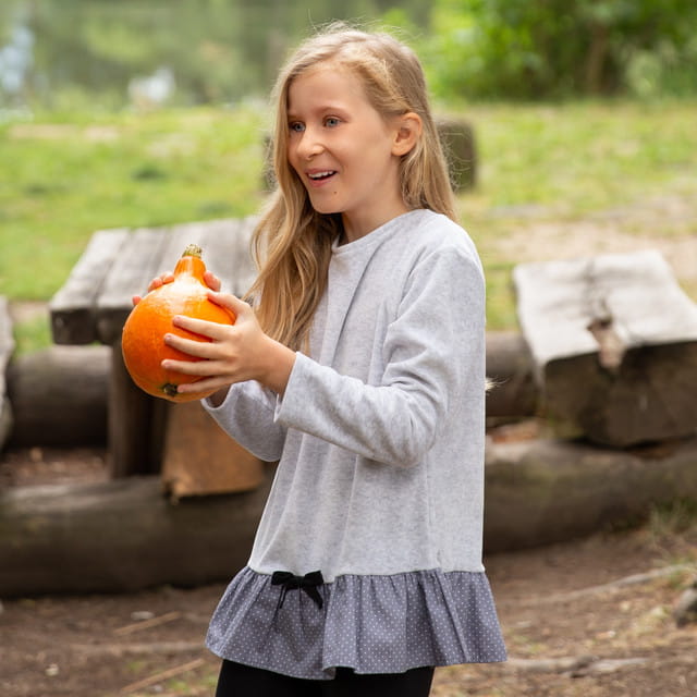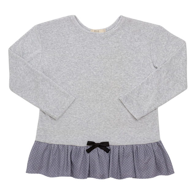 Luźna tunika z wysokiej jakości dzianiny welurowej, w kolorze szarego melanżu (efekt bielonej szarości). Wykończona bawełnianą falbanką w kropeczki. Całość dopełnia czarna bawełniana kokardka. Produkt ukochany przez cały nasz zespół R&L, a przede wszystkim przez dzieciaki. Idealna do legginsów.